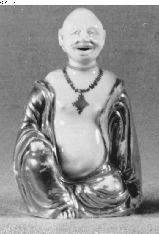 Supplement Oppenheimer: Sitzender Chinese als Brûle-Parfum, goldenes Gewand, goldener Bart und Halskette, Hautpartien Weiß.