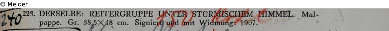 Sammlung Eduard Fuchs bis 1933; 25.10.1933 Beschlagnahmung durch die Gestapo; Versteigerung Rudolph Lepke, Berlin, Katalog 2116, S. 21. Am 4. und 5.11.1937 wurde das Gemälde als Nr. 223 „Reitergruppe unter stürmischem Himmel. Signiert und mit Widmung 1907“ versteigert; ersteigert von dem Slevogt -Sammler Franz Josef Kohl-Weigand für 240,- RM (Schätzpreis 150,- RM); Verbleib unbekannt