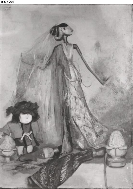 Großes Stillleben mit Puppen, die vermenschlicht dargestellt sind. Eine große Wayang-Puppe steht in tanzender Pose vor einem grauen Hintergrund; zu ihren Füßen sitzt eine kleine, hockende Puppe mit dickem Kopf und großer Perücke. Zwei liegende Puppen auf dem Boden [Auc FM 1920-11-16 no. 169]. Signiert und datiert. Inschrift 1918.