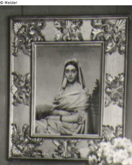Portrait einer sitzenden Dame, im Hintergrund Lanschaft, breiter Rahmen