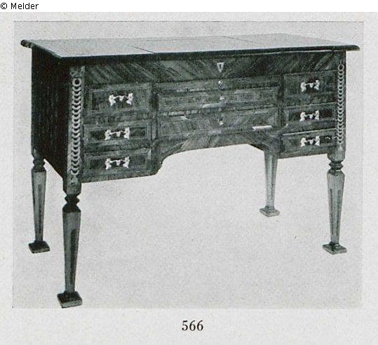 gleichzeitig als Schreibtisch eingerichtet. Das Mittelteil der Deckelplatte aufhebbar und mit Spiegel ausgestattet, die beiden Seitenteile aufklappbar. In der Mitte darunter ausschiebbare Schreibplatte, darunter 2 Schubladen; zu beiden Seiten je 2 kleine Schubladen. Palisander mit Rosen- und Kirschholz eingelegt. Auf spitz zulaufenden Füßen.
