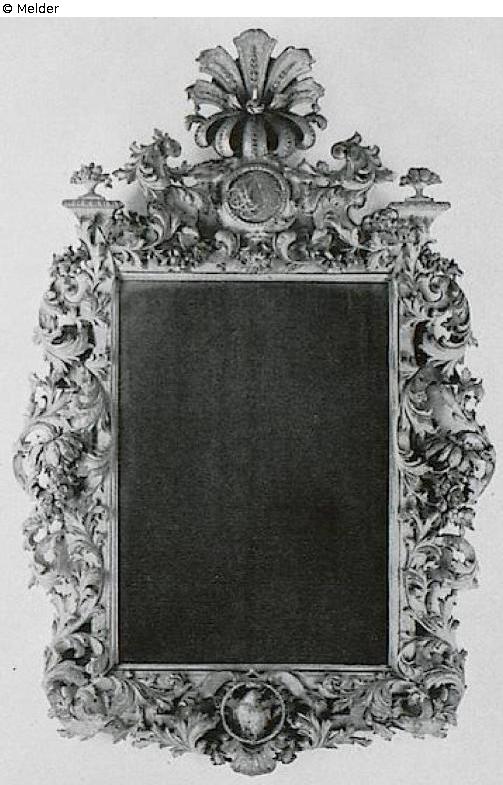 aus Bandwerk mit Akanthusvoluten und Blumengewinden, oben runde Kartusche mit durchbrochenem Spiegelmonogramm und Palmettenbekrönung. Graugelb gefaßt. Holland, Ende 17. Jahrh. Literatur: Auktionskatalog Hans W. Lange, Wertvolles Kunstgewerbe, Berlin, 19.-21. Mai 1941, S. 19. Nr. 55; Taf. 10 (DOI: Externer Link)