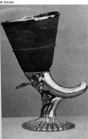 Der Hornbecher ist am oberen Rand und am unteren Ende gefaßt und steht auf einem mit plastischem Eichenlaub verzierten Fußgestell. Das Horn ist gesprungen.