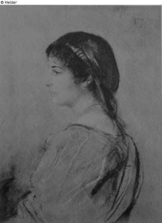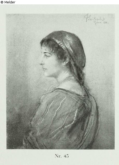 Lebensgroßes Brustbild ohne Hände, Kopf in Seitenansicht nach links, die linke Schulter etwas nach vorn geschoben, sodaß die Rückenlinie sichtbar ist. Kopf Leicht geneigt, Blick zur Seite gerichtet, gebogene Nase. [...] Bezeichnet rechts oben: F. Lenbach Rom 1886. [...] Erworben 1907 in Berlin; alter Eichenholz-geschnitzter Louis XVI.-Goldrahmen, 68 x 55 cm.