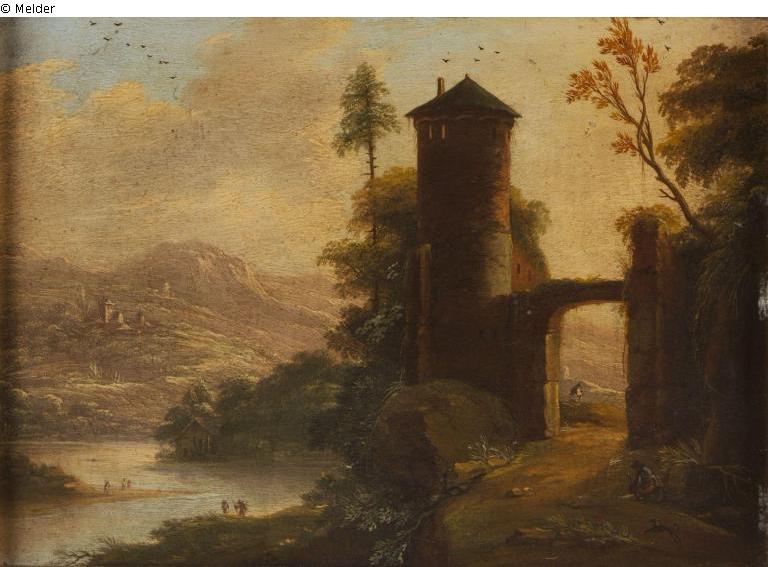 Vergleichsabbildung: Kleine Landschaft (Burgruine mit Ausblick auf hügelige Gegend), Inv.-Nr. 3628/5 (Pendant zu 3628/4)