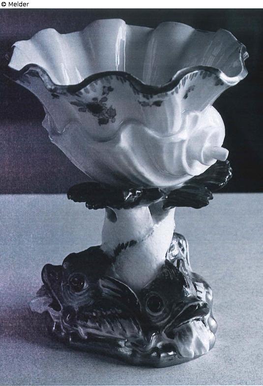 Der Salznapf steht auf einem dreipassigen Fuss mit einfachem vergoldeten Wulstprofil und drei wasserspeienden Delfinen, deren Körper nach oben zu einem Stiel zusammengedreht sind. Die seitlich aufgefächerten Schwanzflossen tragen eine zweifach gestaffelte Muschelschale. Auf der glatt belassenen Fläche befindet sich das gemalte Allianzwappen Brühl-Kolowrat-Krakowsky und auf dem gerippten Teil unter dem Band erscheinen drei "indianische" Blumen und kleine Streublüten. Blaue gekreuzte Schwerter auf unglasiertem Boden.