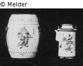 Tonnenförmiger Samovar mit darinstehendem Teekännchen, dessen Deckel gleichzeitig das äußere Gefäß verschließt. Weißes Porzellan mit Malerei in bunten Farben über der Glasur
