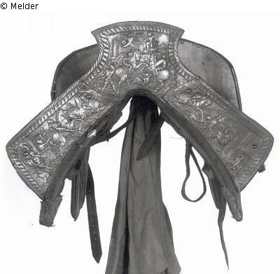 Eiserner Vordersteg, getrieben. Auf der rechten Seite Turnierszene. In der Mitte Reitergefecht, darüber geflügelte Putten als Schildhalter. Links Kampf zwischen Reiter und Fußkämpfer. Alle Szenen mit Stadtansichten im Hintergrund. Geschnürlter Rand. Sattel gehört zu einer im Zeughaus vorhandenen kompletten Pferderüstung bestehend aus: Kanz, Fürbug, Flankenbleche, Gelieger, Sattel (AD 14544 a-e), Rosskopf (AD 14557), Zaumzeug, Trense (AD 117) und Steigbügel (AD 14572).