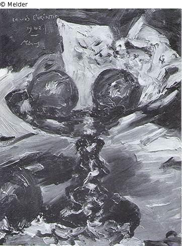 Fruchtschale mit hohem silbernen Fuß. Leuchtend gelbrote Apfelsinen, dahinter helles Seidenpapier. In Berlin gemalt. Bez. o. l.: Lovis Corinth 1922 im März (siehe WVZ Behrend-Corinth, 1958, Nr. 856)