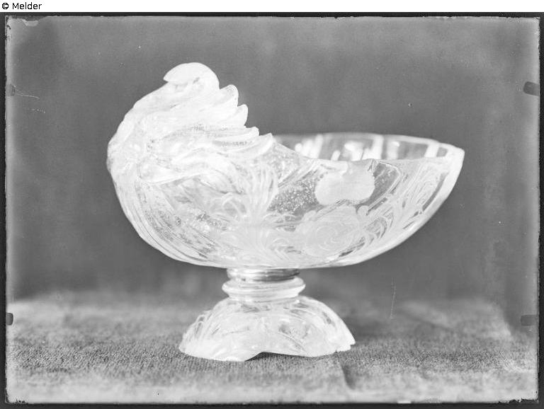 Muschelförmige, ovale Schale mit erhaben geschliffenen Verzierungen. Auf einer Seite das hessische Wappen, auf der anderen die Initialen 'LC' (Landgraf Carl). Muschelförmiger Fuß mit vergoldeter Silberfassung.; Signatur: 'Cassel fecit / 1688'.