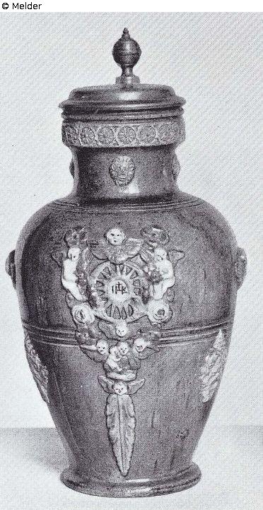Groß, mit Zinndeckel, birnförmig, grüne Glasur mit aufgesetzten Verzierungen, auf der Stirnseite farbige Gloriole, von Seraphim umgeben, seitwärts gelbe Kartusche und farbige Seraphköpfe mit I. H. S., am Lippenrand gelbe Rosettenbordüre