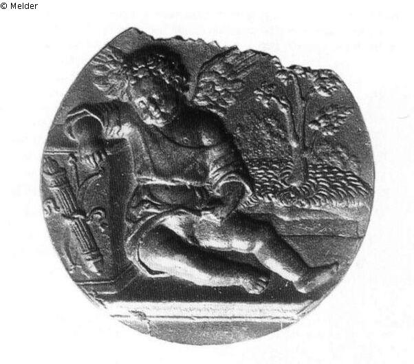 Runde Plakette, der obere Teil ist abgebrochen. Ein schlafender Amor, bekleidet mit einem Hemdchen, lehnt sich an ein Podest, an dem Köcher und Bogen hängen. Rechts hinter ihm blickt man auf ein Gartenstück mit Büschen und einem Baum. Die Plakette wurde dem Pseudo-Fra Antonio da Brescia zugeschrieben, weil sie in vier Exemplaren als Rückseite von "Apollo und Python" (Nr. 131) bekannt ist. Pastorino hat sie als Rückseite der Gracia-Nasi-Medaille verwendet (Armand I 1883, S. 202, Nr. 86). Eine bronzene Hohlform wird in der Biblioteca Ambrosiana in Mailand aufbewahrt (Ferrari Pugliese 1987, Nr. VI.16a). An der Chorwand der Kathedrale von Chartres wurde das Motiv 1529 nachgebildet.