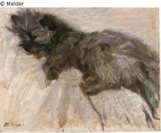 „Auf einem weißen Tuch schläft ein kleines schwarzes und langhaariges Hündchen, wahrscheinlich ein Langhaarschnauzer oder ein Terrier. Souverän nutzt der impressionische Maler das einfallende Sonnenlicht, um zu zeigen, wie dadurch das von weiß über ocker, hellbraun und dunkelbraun variierende Fell, sich auch als farbiger Schatten im hellen Laken reflektiert“ (UW).