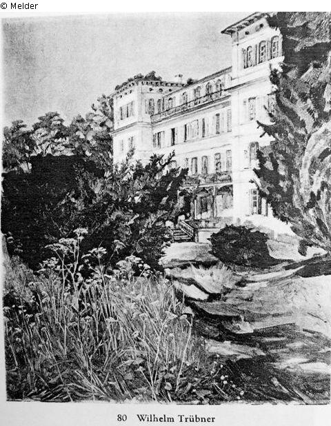 Schloß Hemsbach a.d.Bergstraße. rechts hohe Bäume, Stauden, Buschwerk, Parkweg, sonnen-beschienenes Schlößchen. Rechts unten bezeichnet: W.Trübner. gerahmt