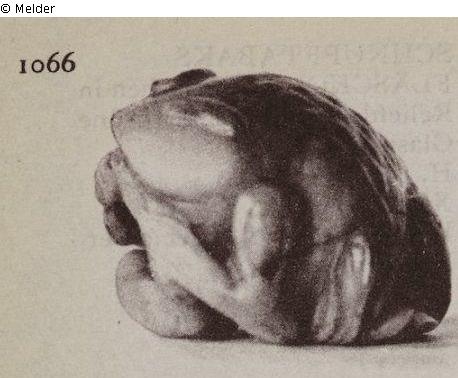 Kröte auf Granatapfelzweig. Jade graugrün und braun.