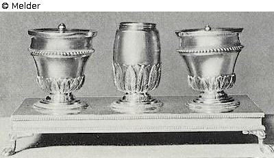 die vasenförmigen Gefäße mit lanzettförmigen Blättern und Perlstäben auf rechteckiger, profilierter Fußplatte mit vier Löwenfüßchen. Gew. 950 g.
