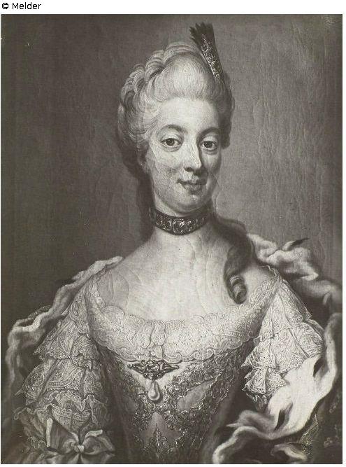 Die Dargestellte trägt: „Weißes, mit Spitzen besetztes Kleid, am Brustausschnitt Perlenschmuck, breites Brillanten-Halsband, weißes Haar mit Brillanten und Federschmuck, blauer Hermelinmantel mit goldenen Kronen.“; vergoldeter Rahmen