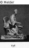 Farbig bemalt. Aus der gleichen Folge wie die Figur Katalognummer 951. Auf grün gepolstertem, lachsrotem Lehnstuhl schräg vor dem von s-förmig geschwungenen grünen Beinen getragenem Instrument sitzend, den Blick auf ein Notenblatt auf dem mit Goldfransen besetzten, rosavioletten Teppich gerichtet. Der weiße Plattensockel golden gerändert. Marke: Doppel-C mit Krone. Staffiererzeichen nach links gewandtes S in Rot. Beschreibung Lange: Auf grüngepolstertem, lachsrotem Lehnstuhl schräg vor dem Instrument sitzend, den Blick auf das Notenblatt gerichtet, welches auf mit Goldfransen besetztem, violettem Teppich liegt. Marke: Doppel-C mit Krone. Staffiererzeichen, nach links gewandtes S in Rot.