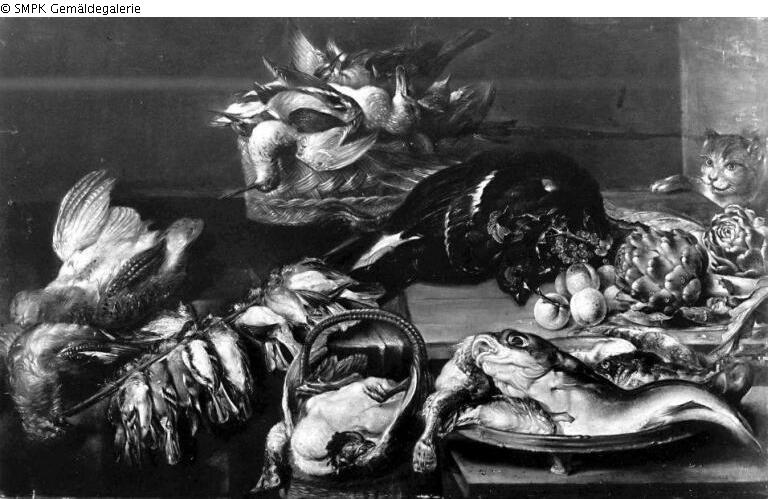 Tafelmalerei: Bild: Lebensmittel; Stilleben mit Lebensmitteln & Behälter aus Holz: Faß, Tonne & Teller, Platte & Geflügel (Hahn, Henne, Huhn, etc.) & gerupftes Geflügel & Fisch; Fischstilleben & Katze; Speise; Stilleben & Holz; hölzern; Faß & Teller & Geflügel & Geflügel & Fisch; Stilleben & Katze; Signatur: Rechts unten: A.ex. Adriaenssen fec.; Maße: 57 x 94 cm