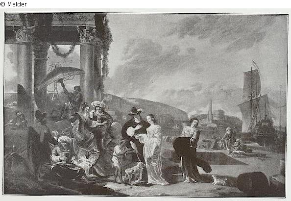Südliche Hafenlandschaft mit Säulenarchitektur und reicher Staffage von Kaufherren mit ihren Frauen und Gefolge