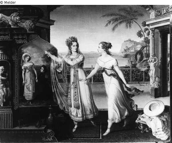 Desargus- Lemiére als Aline, Hoguet- Vestris als Zelie. Mehre Vorzeichnungen, darunter eine Kompositionsskizze, im Mendelssohn- Archiv der Stadtbibliothek zu Berlin. Am 20. bzw. 26. Juli 122 datierte Porträtzeichnungen der beiden Tänzerinnen in Privatbesitz, München. Das Gemälde am 3. Juli 1823 für 120 Frd'or erworben (Journal I 255) . März 1824 im Königlichen Palais platziert. Nach dem Tod Kaiser Friedrichs III. im Generalkatalog inventarisiert. 1909 im Gemäldevorrat Schloss Schönhausen. 1925 in das Hohenzollernmuseum. Um 1935 im Generalkatalog inventarisiert.