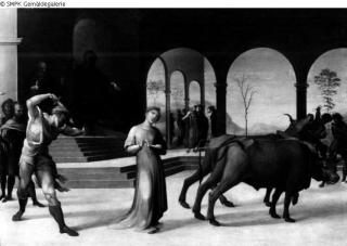 Tafelmalerei: Bild: die heilige Lucia soll von mehreren Ochsen zu einem Bordell gezerrt werden, läßt sich aber nicht fortbewegen; fesseln; Ochse; zerren; Bordell