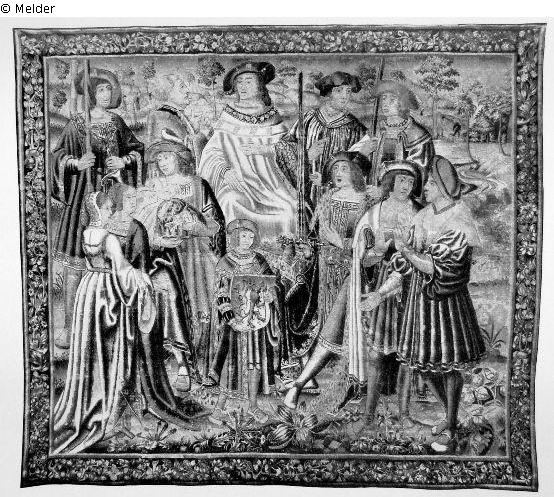 Tapisserie. Wolle und Seide gewirkt, vor Landschaft thronender Fürst, umgeben von Hofleuten, vor ihm Wappen haltender Page. Blau grundierte Bordüre mit Blütenranke. Reparaturen.