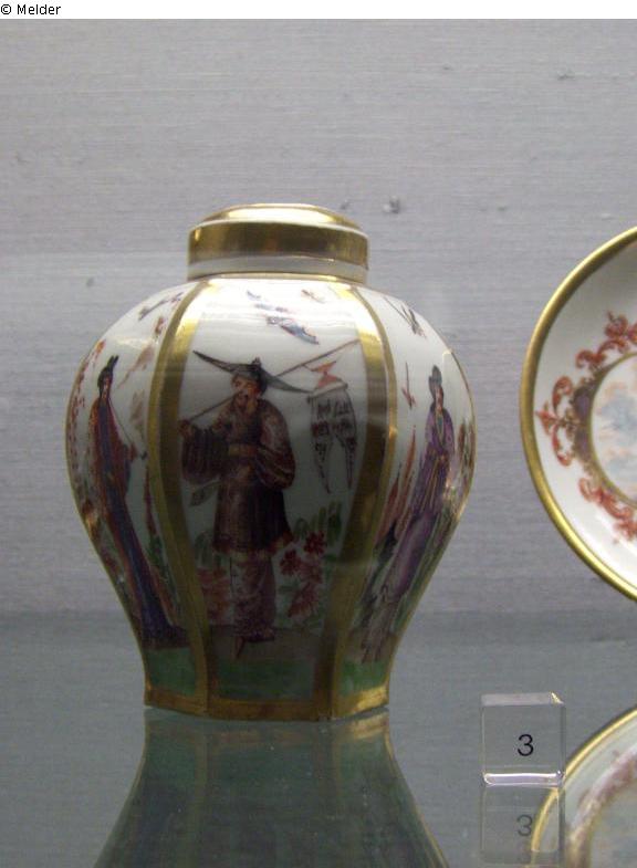 HF 28 ab in Kunstgewerbemuseum Berlin; vielleicht später zugefügter Bestandteil des "Reiseservice aus neun zusammen gehörigen Teilen" → 50 (Simonis - Porzellan), Beschreibung dort: "Teebüchse mit Deckel: 6seitig mit vergoldeten Rippen, Deckel mit lüstrierter Goldrosette, Bemalung: in den sechs Feldern große, bunte Chinesengruppe. Diese und die folgende Teebüchse nicht ursprünglich zugehörig zu dem Reiseservice [HF] 19 -27 nach dem Verzeichnis der Dresdner Bank sind beide bei Nr. 93 nicht angerechnet (missing); Teebüchse mit Deckel: sechsseitig mit vergoldeten Rippen. Deckel mit verblichenen (?), vergoldeten Feld (missing), Bemalung: bunte Chinesenfiguren, bew. Gruppen nebst Palmen, Fels, Pavillon, Baldachin" In: NARA M 1947, Textual records created at the Wiesbaden Central Collecting Point include administrative files and monthly reports, Claim: [Germany]-Feist-Wollheim, Hans, 1945 - 1948, Blatt 3.