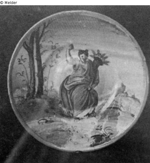 Einer von zehn gleich großen Tellern. Darstellung: Fortuna mit Füllhorn.