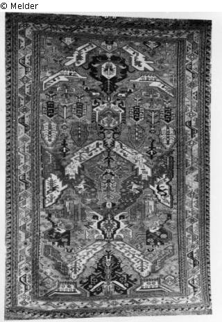 Teppich in geflochtener Gobelintechnik (Sumakh.), Fond blaßrot. Muster Figur, groß, weiße blattähnl. etc. (Felder mit geometr. Motiven, Bordüre. fortf., Mitte gelb).