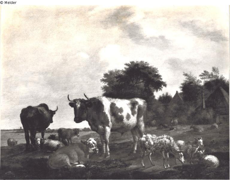 ähnliches Gemälde in Dresden (identisch mit Holland 17. Jahrhundert); Kühe auf der Weide; rechts hinten Häuser unter Bäumen;