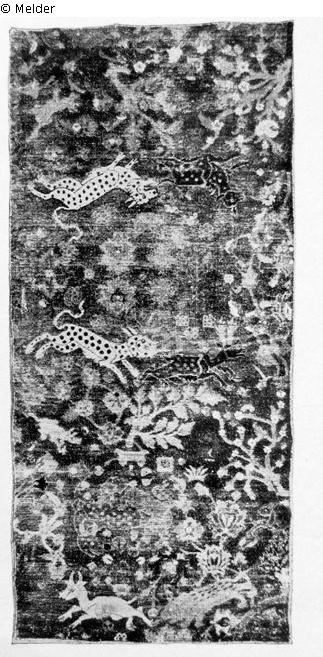 auf rotem Grund zwischen Blütenzweigen Gazellen, verfolgt von Panthern.