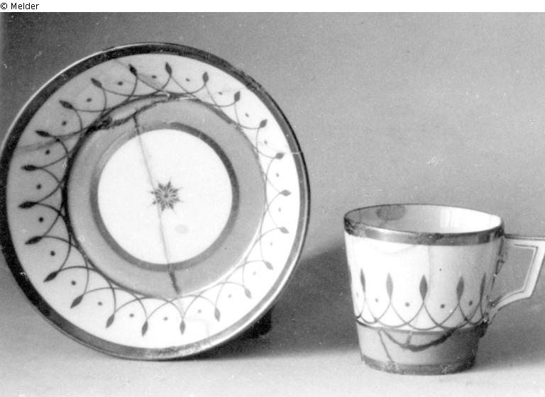Dekor: grüner Fondstreifen und Goldverzierung. Mehrfach zerbrochen und gekittet. Szeptermarke L 9 in rot, Trockenstempel 33