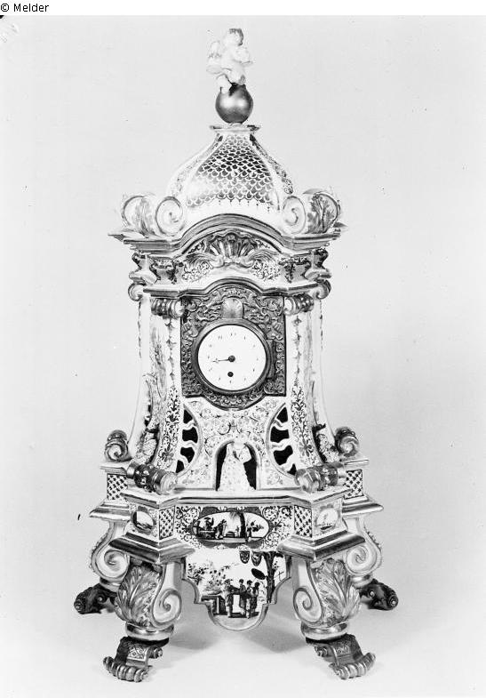 Meißner Uhr mit durchbrochenen barocken Gehäuse von Georg Fritzsche, Figuren von Johann Gottlieb Kirchner (?), datiert, Schwertermarke, Bemalung von Herold, signiert "Barrey a Paris". Hockende Chinesenfigürchen in den drei Bogennischen. Ähnliche Exemplare in der Ermitage, St. Petersburg, Hetjens-Museum, Düsseldorf und Rijksmuseum, Amsterdam. Quelle: Ludwig Schnorr von Carolsfeld: Porzellan der europäischen Fabriken des 18.Jahrhunderts. Berlin 1920. S.53; Vgl. Beschreibung ähnlicher Exemplare in A.L. den Blaauwen: Meissen porcelain in the Rijksmuseum. Amsterdam Zwolle 2000., S.93ff. Clock Case, Nummer 48 (dort auch Abbildungen) und Ludwig Schnorr von Carolsfeld (Hrsg.): Sammlung Margarete und Franz Oppenheim: Meissener Porzellan. Berlin 1927, Nr. 135, Kaminstanduhr, S.44f. "In den figürlichen Einzelheiten stimmt die Uhr bis auf die bekrönende Gruppe mit dem Exemplar der Sammlung Feist in Berlin überein. Das Exemplar in der Eremitage in Petersburg (Leningrad) zeigt an Stelle der kleinen Chinesenfigürchen liegende Löwen, an Stelle der Frauenmaske einen Faunskopf, als Bekrönung der Kuppel zwei plumpe nackte Kinder."