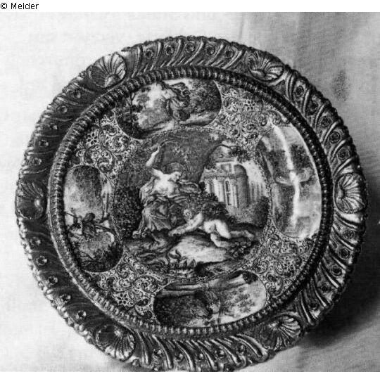 Eine von sechs Unterschalen auf Fuß; Emailbemalung: Im Spiegel je eine mythologische Szene, gerahmt von Rankenwerk und je vier querovalen Medaillons. Jeweils reliefierte Ränder mit Muschelornamenten. Zu Ahv 351 und 359 bis 364 gehörend.