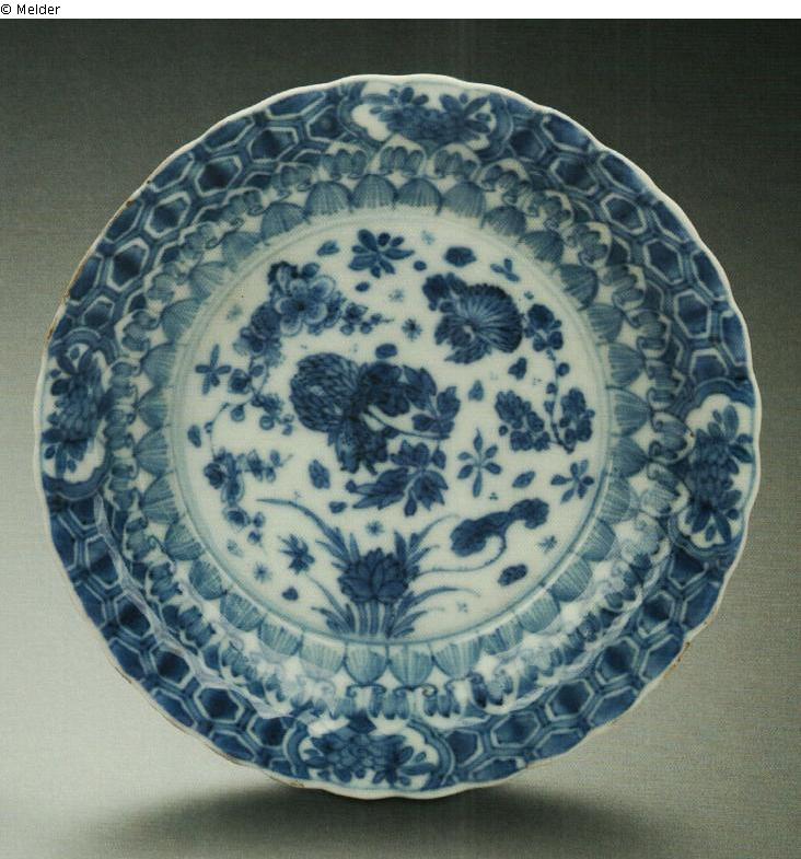 Keramik (Porzellan) ; Unterglasurfarbe kobaltblau / Emaillemalerei