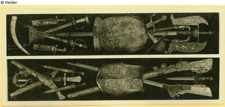 Tafelmalerei: Bild: Stilleben mit verwandten Gegenständen : Waffen