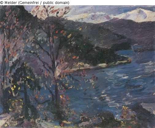 lt. Inventar Dr. Bernhard Stephan (1930): Zum tiefblauen Wasser, über dem weiße Wellen aufleuchten und das den Blick durch eine Baumgruppe links im Vordergrunde räumlich abrückt, in der gelbe, rote und weiße Tupfen mit stark blühender Kraft hervortreten, senkt sich von links her, tiefgrün bis zu dunkelviolett, der Berghang hinab, überkrönt vom Weiß der Wolken und hoher Gipfel. Die Farbigkeit des Bildes ist überflutet von einer warm violetten Stimmung, die alles wie in einem einzigen Atem zusammenschmilzt, der aus der Erregung hingebender Empfindung strömt.