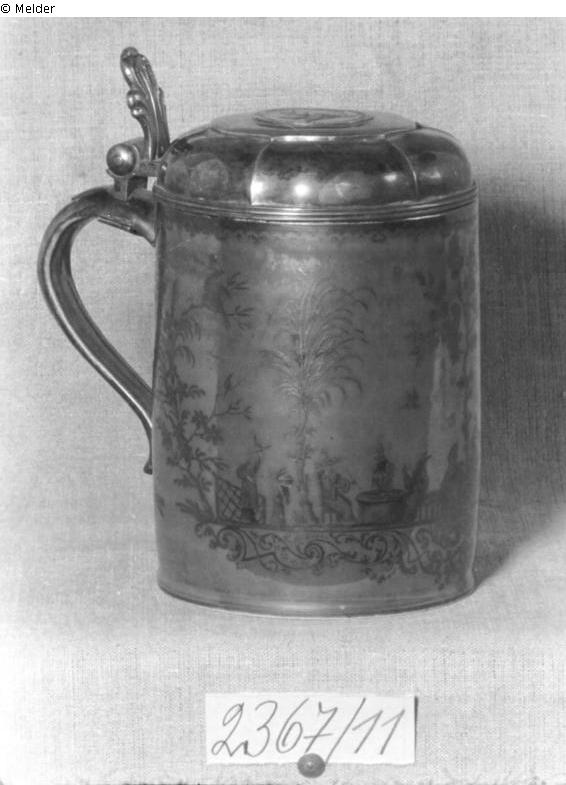 Muller & Cie: Walzenkrug mit Dekor in Silber auf einem braunen Hintergrund: Chinoiserien mit einer Terrasse. Deckel aus geschmiedeten Silber, enthält eine Medaille, die ein Reiterportrait von Friedrich dem Großen zeigt, auf der Rückseite das Datum: 1741. - Höhe 19,5 cm. Marke gekreuzte Schwerter in blau. Sammlung Dr. Franz Oppenheimer. Handschriftliche Marginalie: 675,-