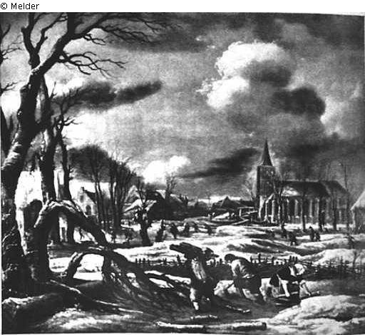 Hinter einer Baumgruppe führt links eine Häuserreihe in den Bildgrund. Rechts Kirche, davor beschneiter Platz mit gefrorenen Gewässern, auf denen Bauern sich dem Eisvergnügen ergeben. Vorn zwei Bauern und eine Frau beim Holzsammeln. Dunkler, blaugrauer Wolkenhimmel. Goldrahmen. Bezeichnet rechts unten mit Monogramm. Ehemals Paris, Sammlung Alphonse Kann.