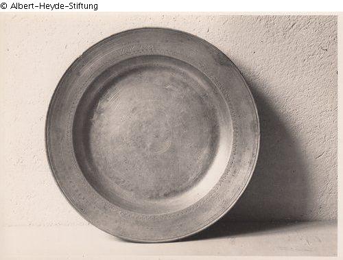 Flache Schüssel mit umlaufendem Punzdekor am Innenrand der Fahne. Im Spiegel starke Abdrehspuren. Bezeichnet "W. W. 1743".