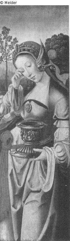 Zwei Altarflügel: Joseph von Arimathia, in schwarzem pelzbesetztem Gewand, mit Hammer und Nägeln in den Händen, Magdalena mit Salbgefäß, rosa Gewand, Kniestücke vor Landschaft