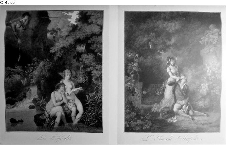 Gegenstücke: Liebespaar - Junge Männer entwenden zwei badenden Mädchen mit der Angel die Schuhe. Nach Schall. Gr. Folio, Aquatinta, in Farben gedruckt, Herrliche Abdrucke von unübertrefflicher Farbenfrische