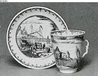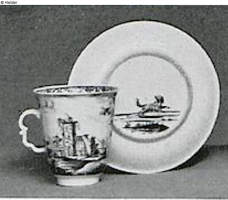 Die hohen Tassen haben einen Henkel mit reliefierter Daumenauflage. Bemalt in Schwarzlot mit Flußlandschaften und Bordüren. Auf den Unterseiten der Schalen Hunde. Ohne Marke. Wien, bei Du Paquier (1718–1744). Literatur: Auktionskatalog Hans W. Lange, Wertvolles Kunstgewerbe, Berlin, 19.-21. Mai 1941, S. 126. Nr. 622, Taf. 75 (DOI: Externer Link)