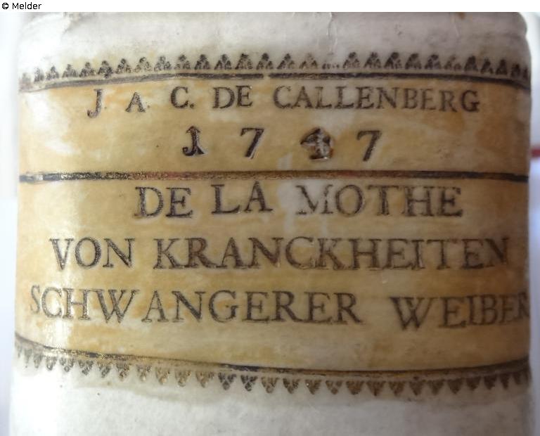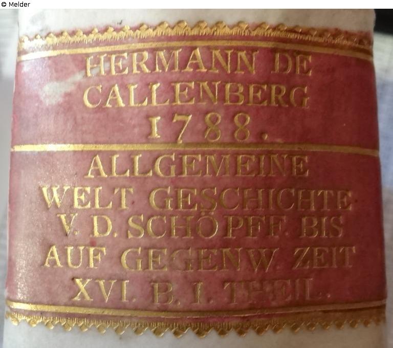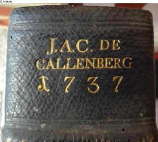 J. A. C. DE CALLENBERG (Johann Alexander Reichsgraf von Callenberg 12.3.1697 - 13.2.1776)goldene Schrift auf weißem oder ursprünglich gelbem (vergilbt) Hintergrund, drei Zeilen mit Jahreszahl und unter dem Trennstrich der Buchtitel