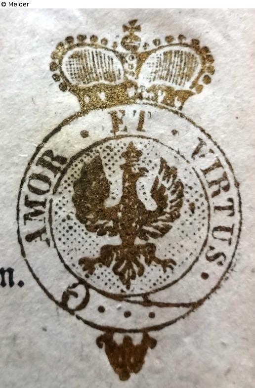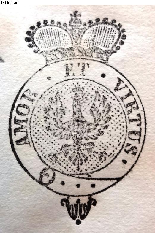 Kreisförmiges Wappen mit Fürstenkrone, im Wappen Adler und umlaufendes Spruchband mit dem Spruch „AMOR ET VIRTUS“Gold, auf verschiedenen Vorlagen
