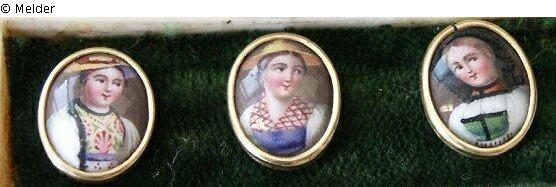 Drei kleine ovale Miniaturen (weibliche Bildnisse, jeweils 7 x 5 mm, unsigniert) in einem Elfenbeinkästchen (6 x 2 cm), Kästchen mit dem Monogramm "MR"