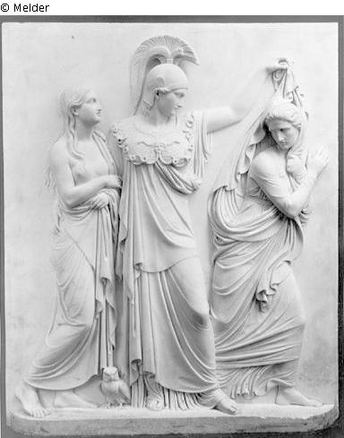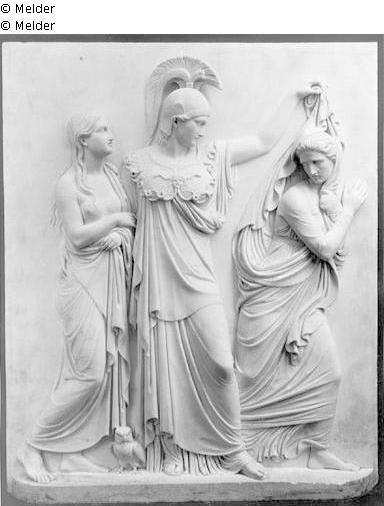 In the middle Athena (head to the right) with helmet, at her feet the owl. On the left the virtue with exposed upper body. Athena grabbing the robe of the turning away vice above.