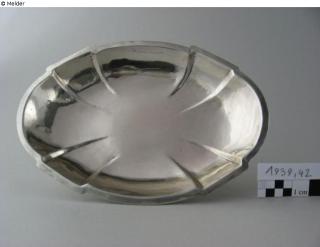 The small, silver drinking bowl is oval and has a decorative design with eight folds. The folds cause the flat rim to spring back and forth slightly. The bowl rests on a smooth-walled, short centre piece that widens conically towards the bottom and is set on a curved foot with a flat base ring.