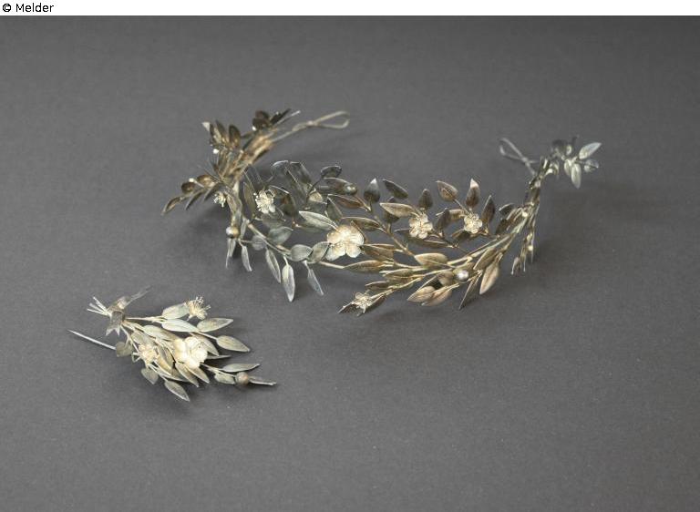 Diadem for the bride in the form of myrtle branches with leaves, flowers and berries; accompanying pin for the groom. In original box of colored cardboard: cover black, wall dark green, inside and underside blue. The box carries on the underbody a hexagonal numeric label with handwritten designation "O I / KE.OE";